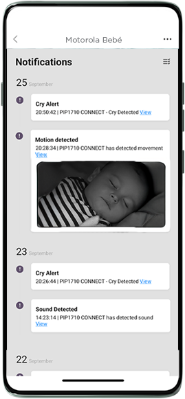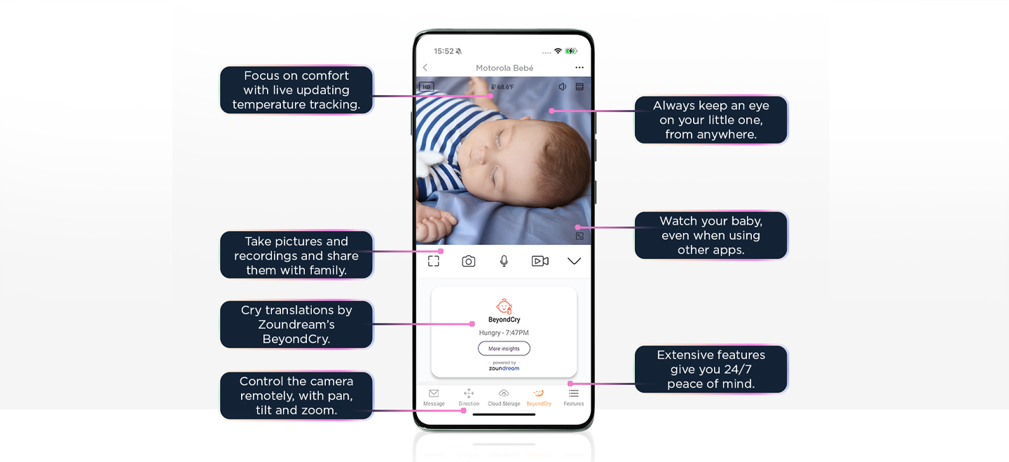 Wherever you are, stay connected with the Motorola Bebé app. Designed with the very best technology to help you keep an eye on your little one.